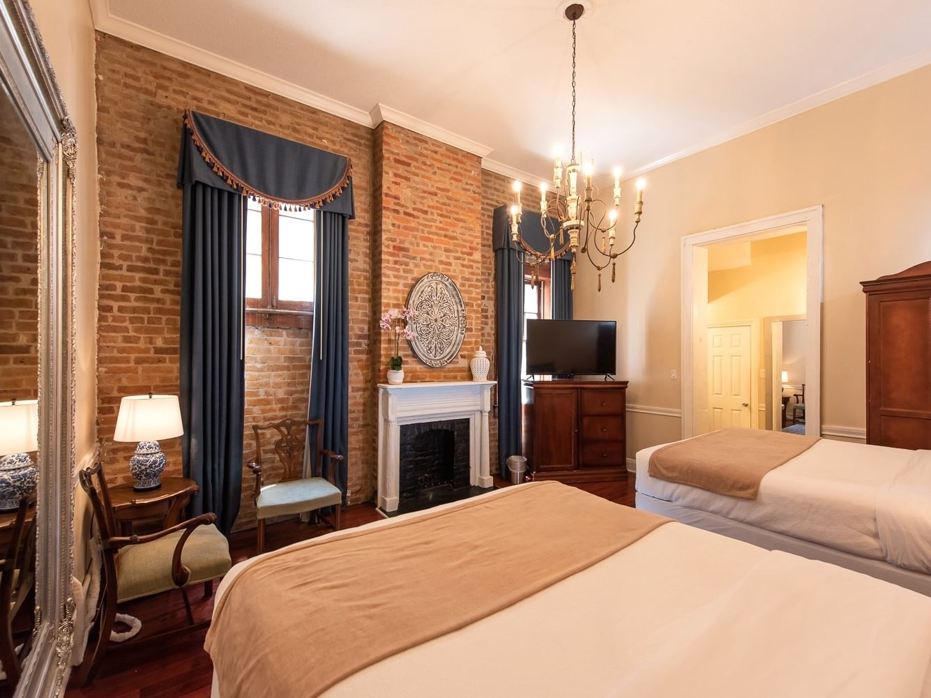 Unwind after a long day of exploring New Orleans in this spacious room with two queen beds with exposed brick and high ceiling. The room will make you feel like you are joining a second line watching the musicians play on Burgundy, on your balcony.